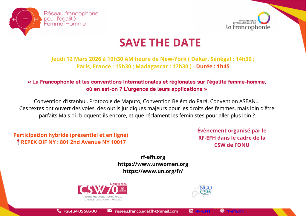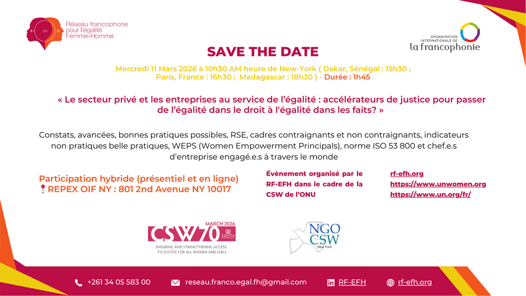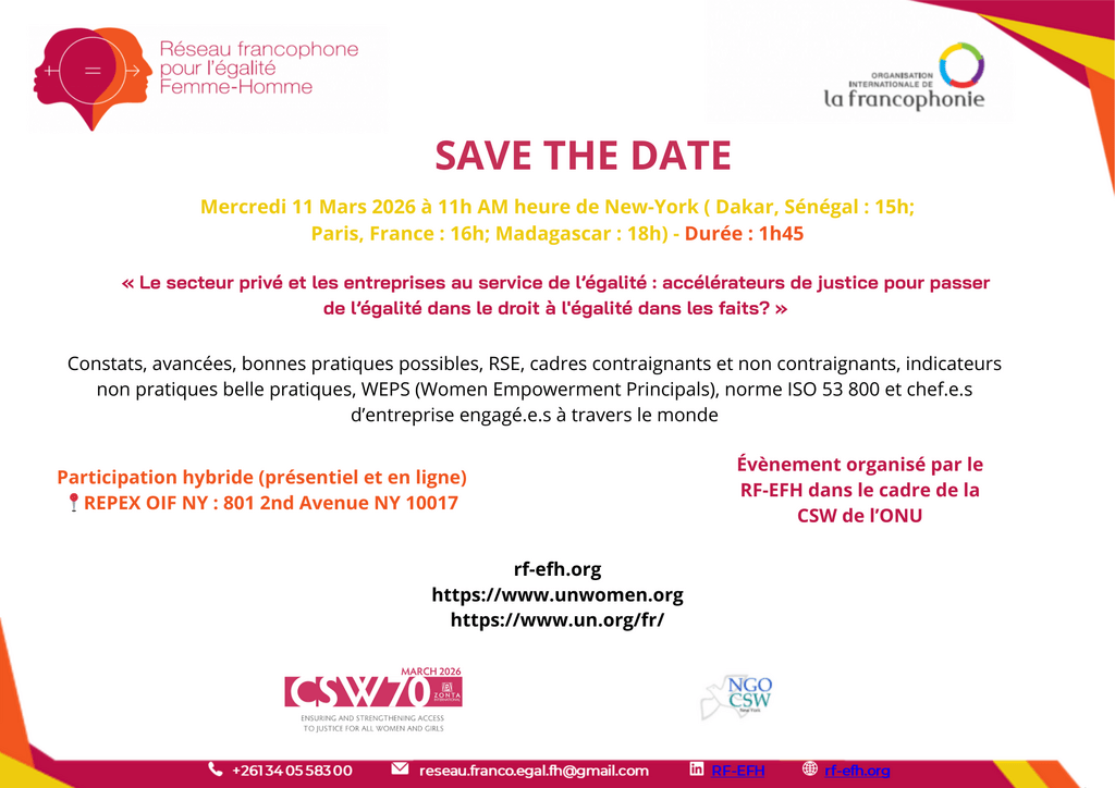 Le Réseau Francophone pour l’Égalité Femme-Homme (RF-EFH) se mobilise pour la 70ème session de la Commission de la condition de la femme (CSW70) à New York. Dans le cadre de cet événement mondial, nous vous invitons à participer à nos deux panels thématiques organisés en format hybride (présentiel à New York et en ligne):