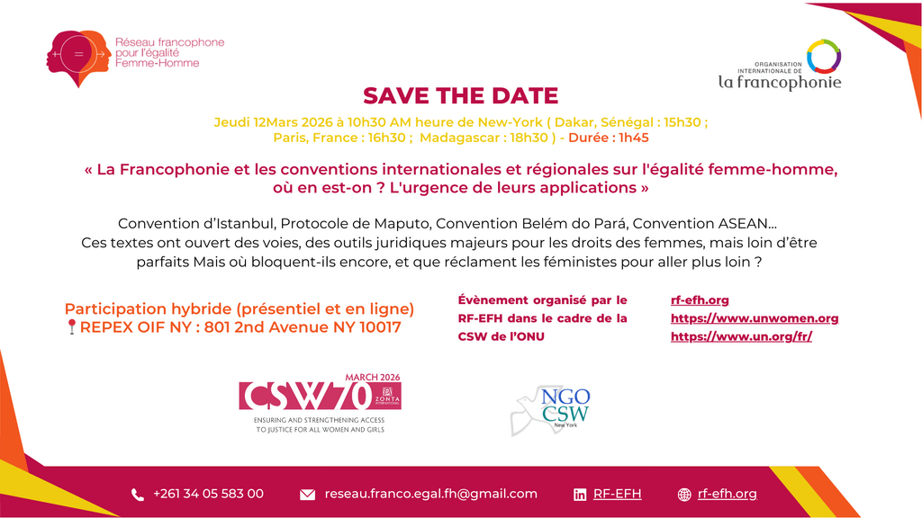 - Thème : La Francophonie et les conventions internationales et régionales sur l’égalité femme-homme : où en est-on ? L’urgence de leurs applications.